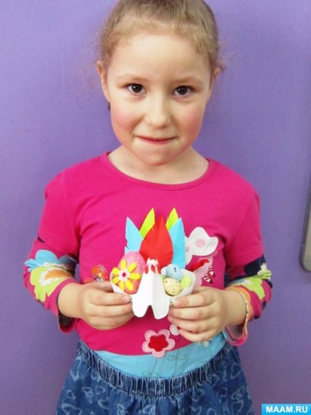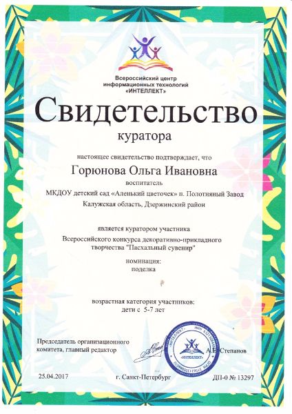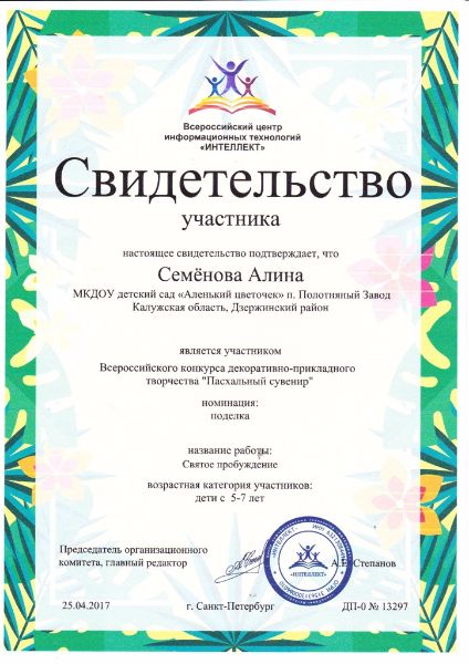 В начале апреля воспитанница средней группы Семёнова Алина вместе с воспитателем Горюновой Ольгой Ивановной участвовали во Всероссийском конкурсе декоративно – прикладного творчества «Пасхальный сувенир». И заведующий детским садом отметила участницу ценными подарками.