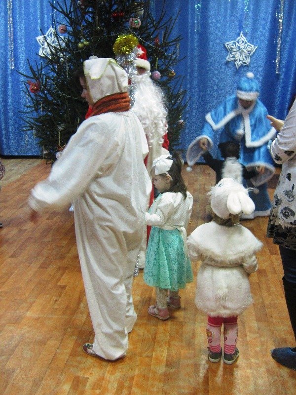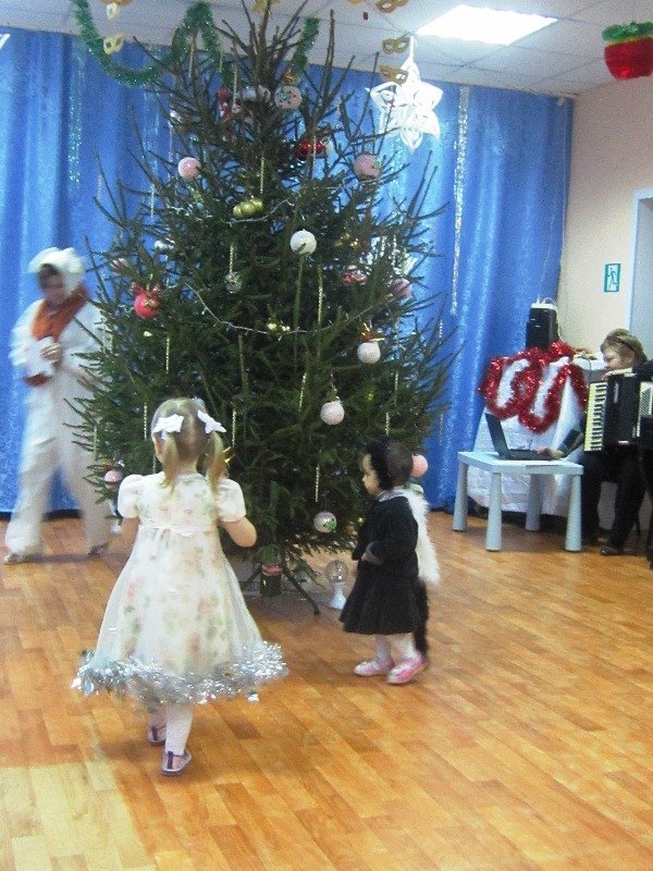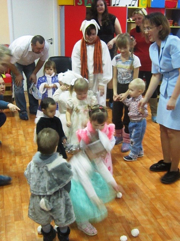 По сценарию музыкального руководителя малыши в новогодних костюмах вместе со Снегурочкой водили вокруг ёлочки хоровод. Дети с большим восторгом и с радостными эмоциями поиграли в подвижную игру с зайчиком и спели песенку.
