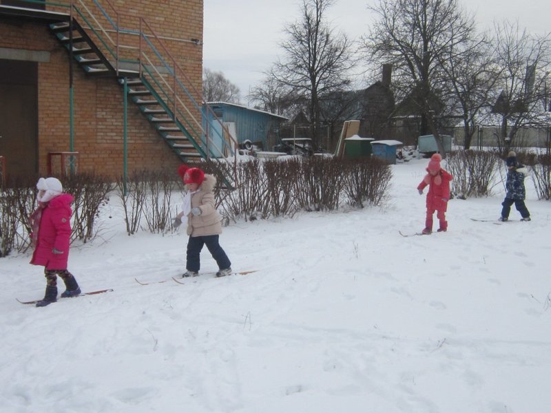 Цель: учить ходьбе на лыжах по ровной лыжне, скользящим шагом.