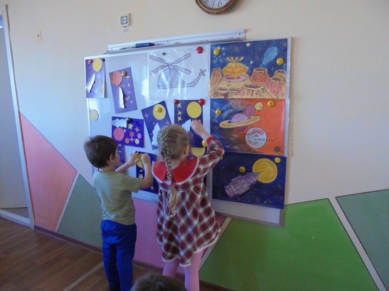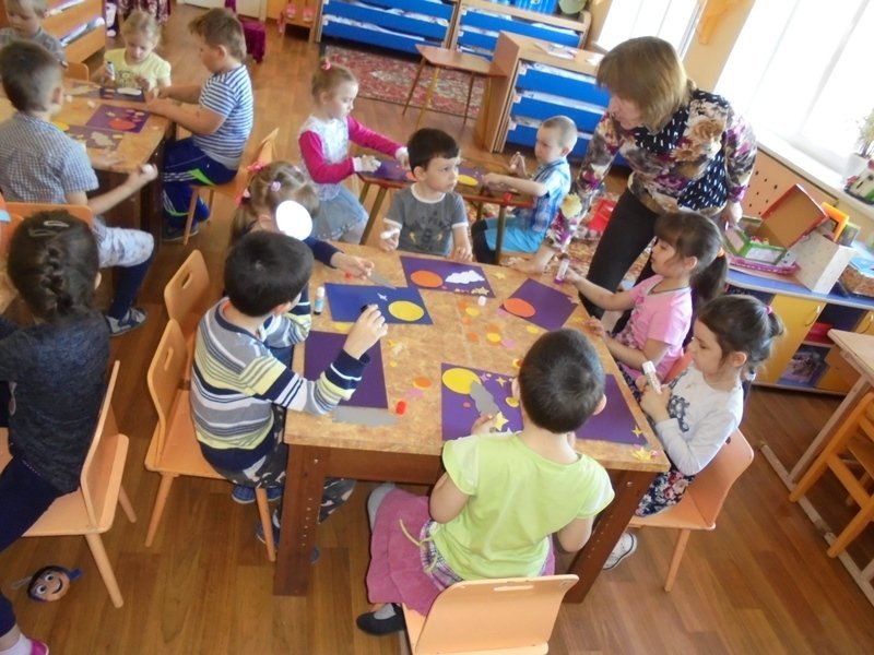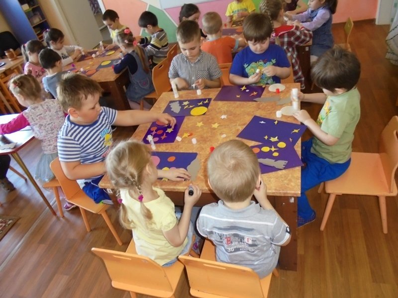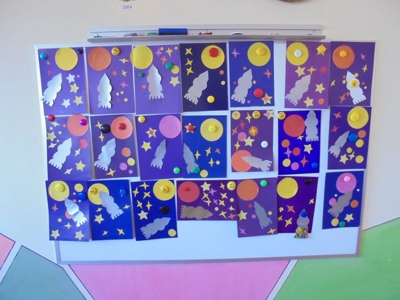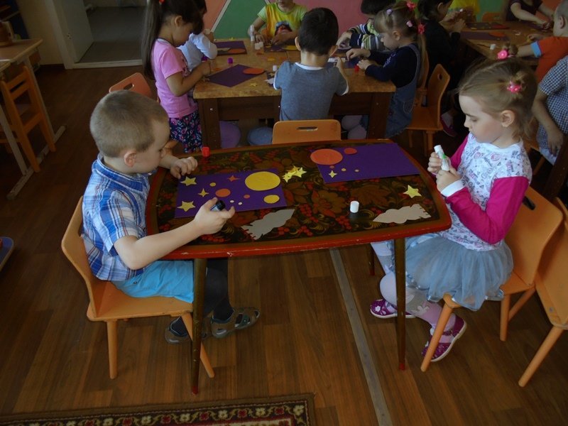 13 апреля дети средней группы вместе с воспитателем Горюновой Ольгой Ивановной клеили аппликацию на тему: «Ракета в космосе».