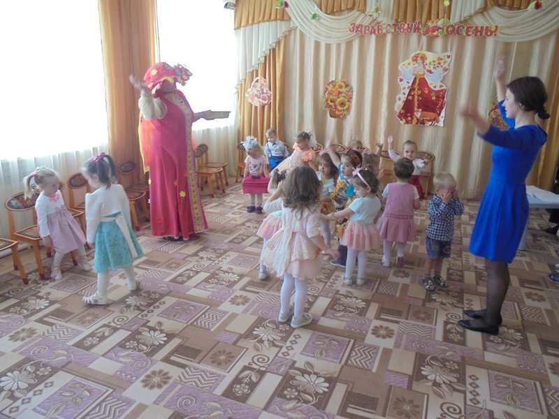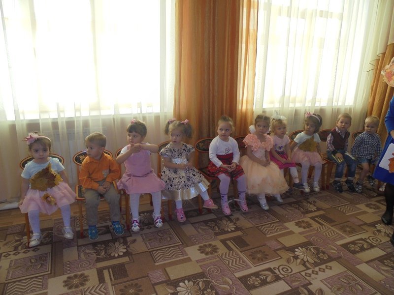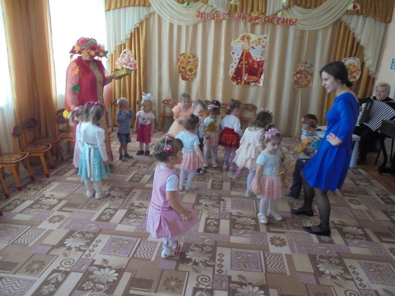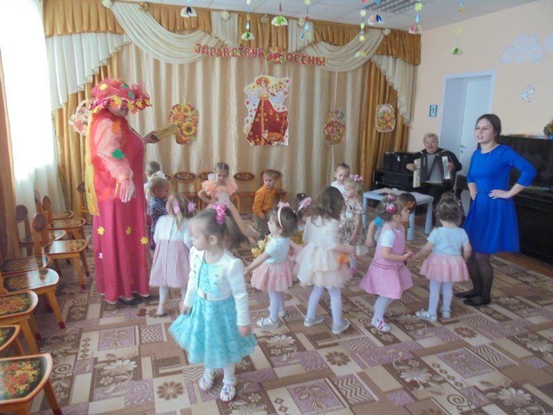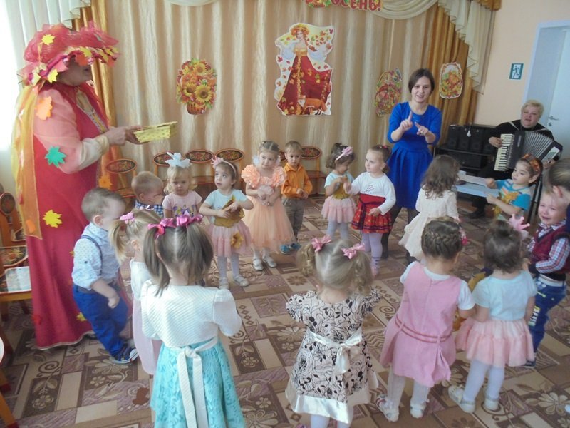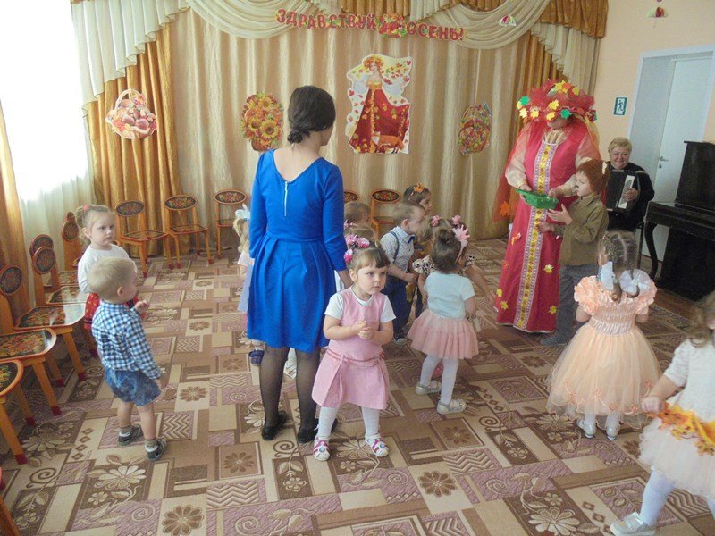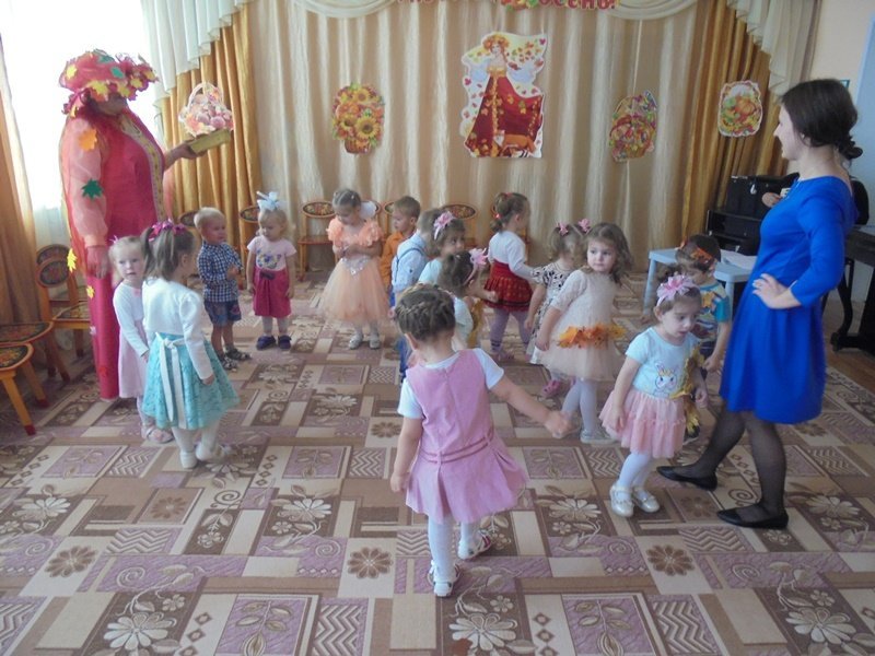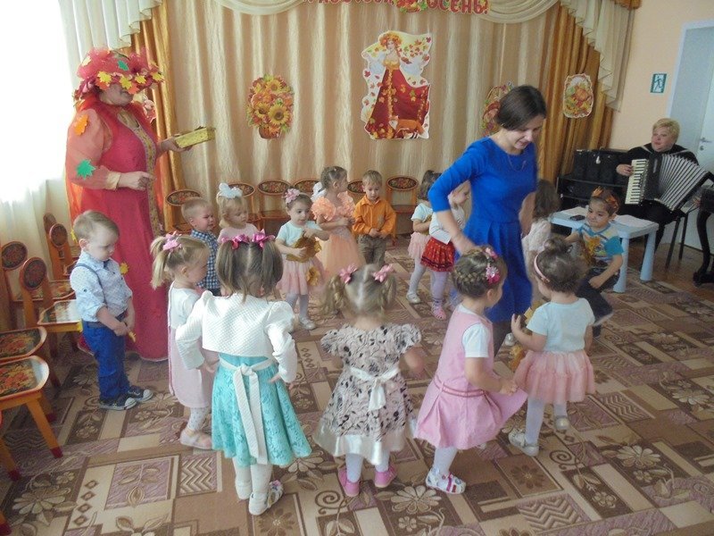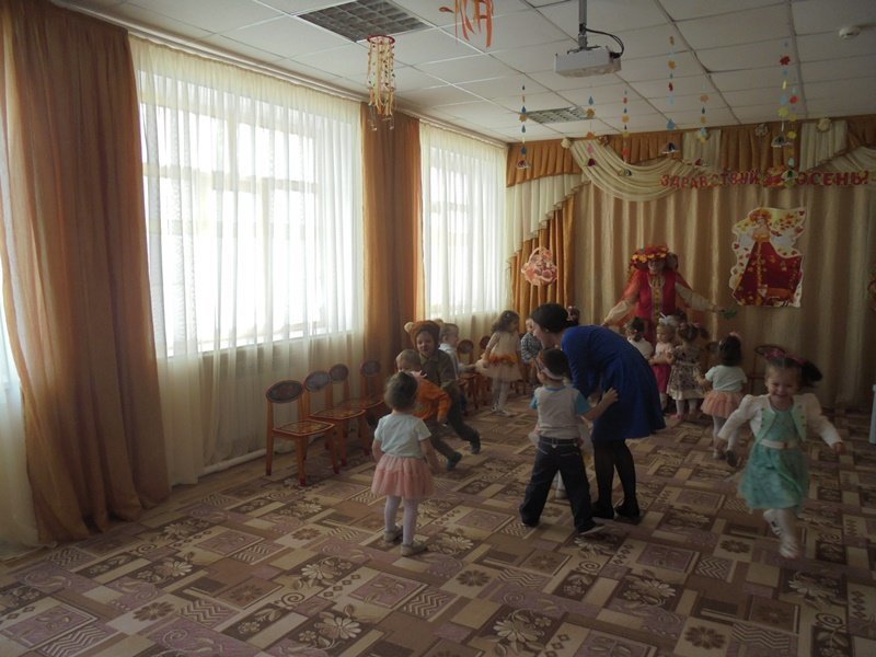 19 октября в первой младшей группе прошёл первый бал – Осенины. В гости к малышам приходила Осень. Она поиграла с детьми в игры с листьями, в прятки от дождя. Дети танцевали под осенние песни. После мероприятия Осень подарила детям сладкие презенты (яблоки). А ещё в гости к малышам приходил Мишка. И тоже поиграл с детьми в игру «Ловишки» и «Собери грибы»