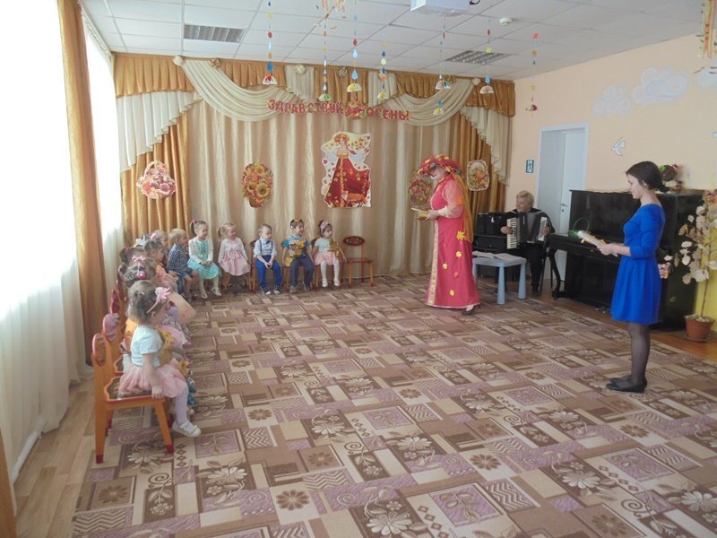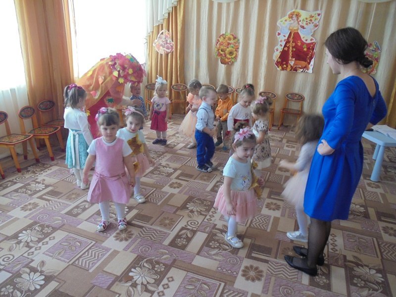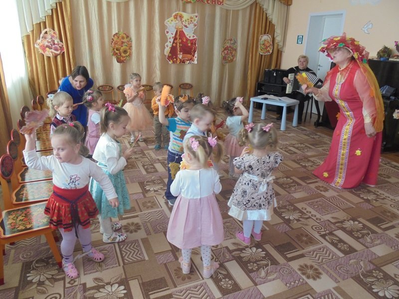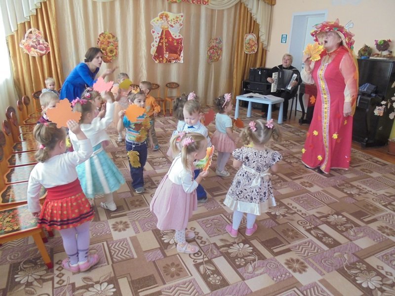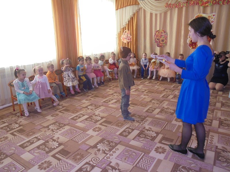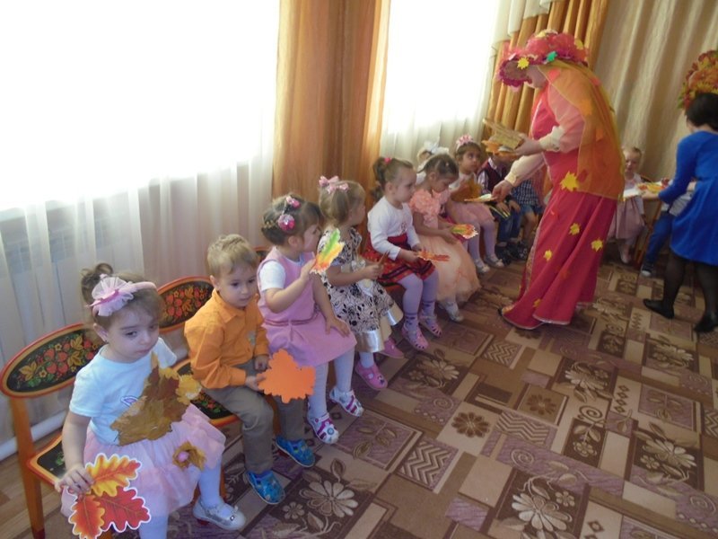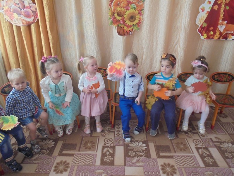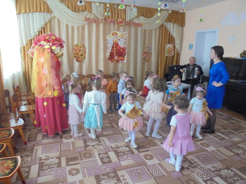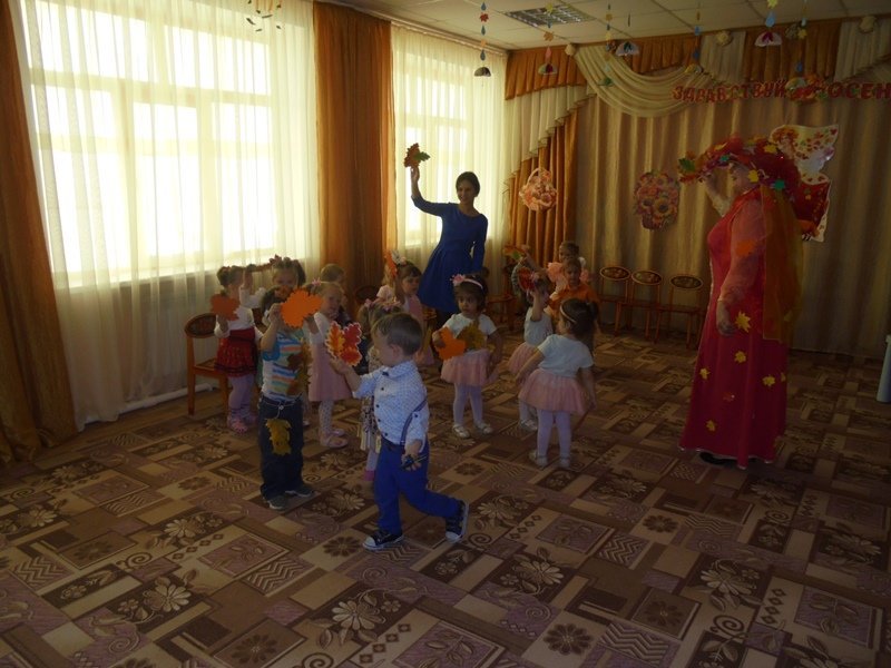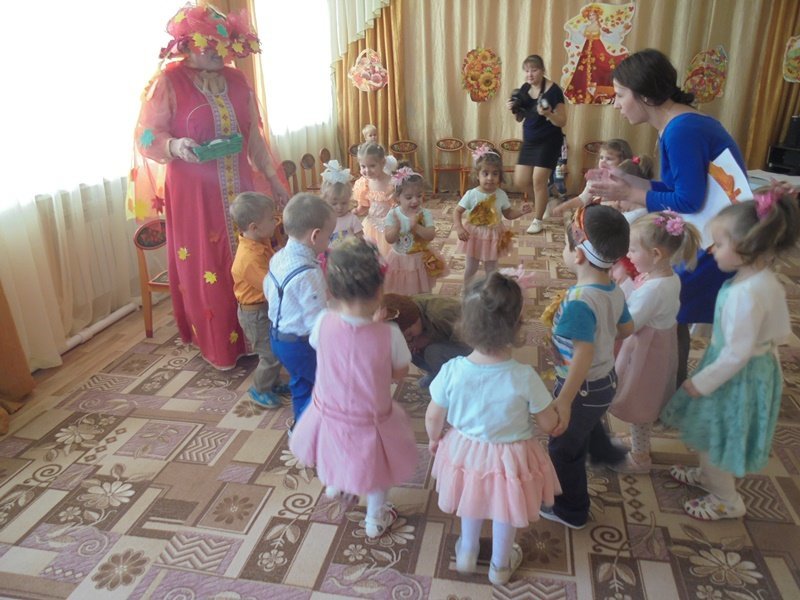 19 октября в первой младшей группе прошёл первый бал – Осенины. В гости к малышам приходила Осень. Она поиграла с детьми в игры с листьями, в прятки от дождя. Дети танцевали под осенние песни. После мероприятия Осень подарила детям сладкие презенты (яблоки). А ещё в гости к малышам приходил Мишка. И тоже поиграл с детьми в игру «Ловишки» и «Собери грибы»