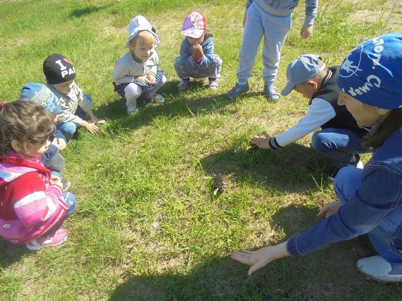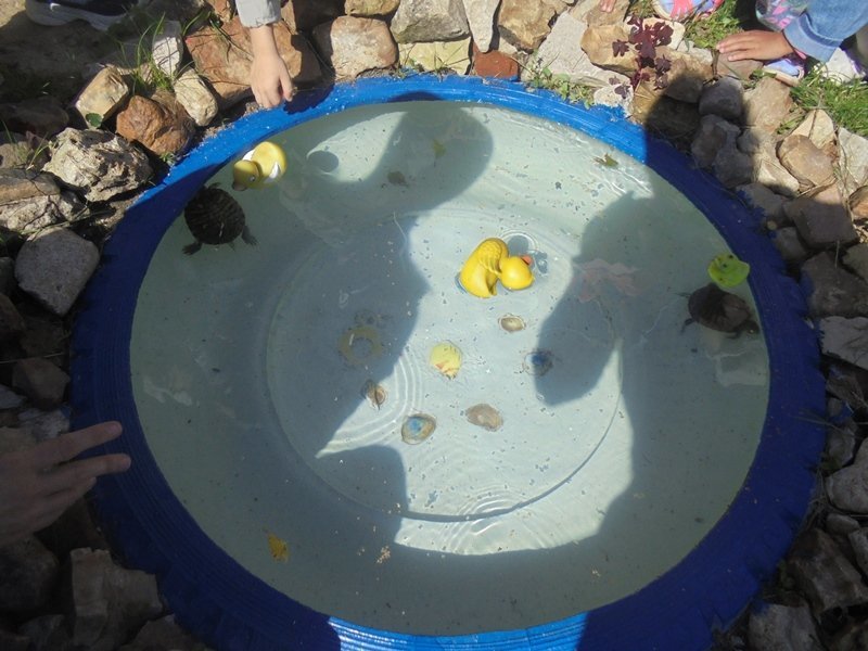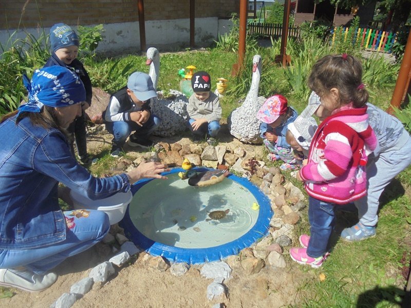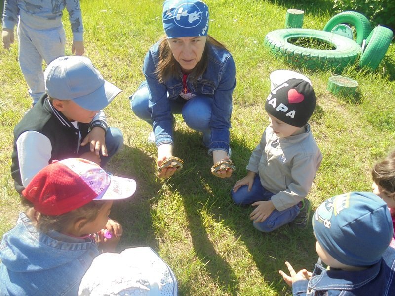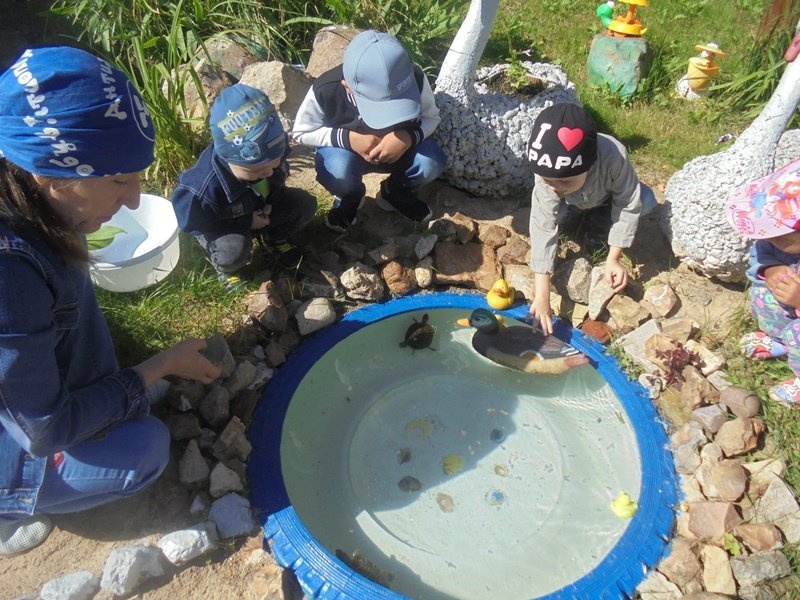 13 августа воспитатель Горюнова Ольга Ивановна вместе с детьми на прогулке наблюдали за черепахами в минипруду и на полянке.