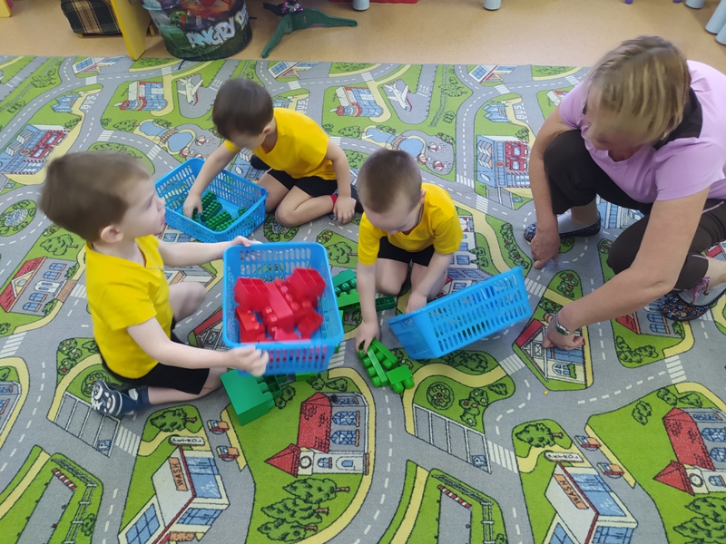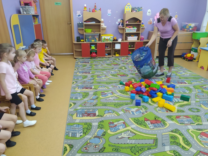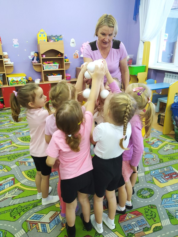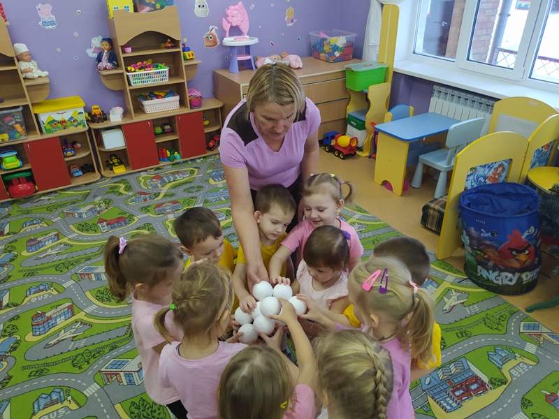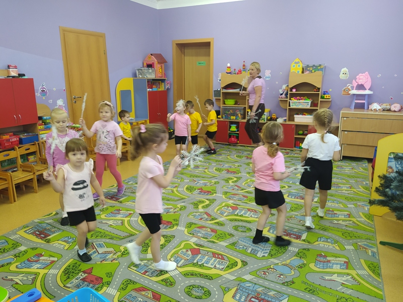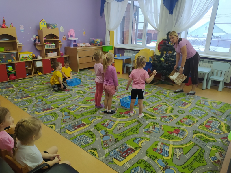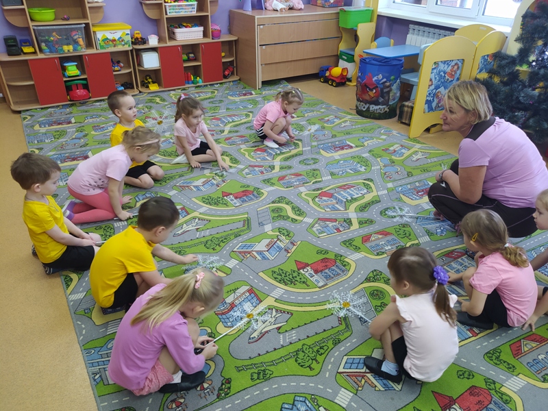 Воспитатель Калугина Лариса Леонидовна вместе с малышами весело и задорно поиграли с кубиками лего, "снежными комочками" и искрящимися снежинками.
