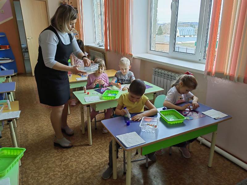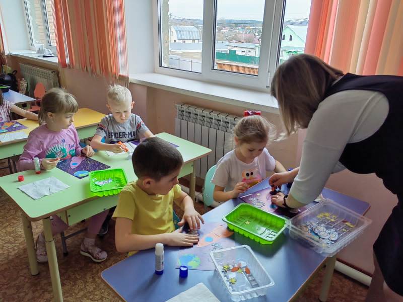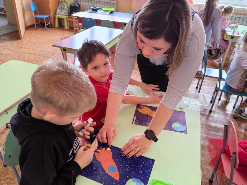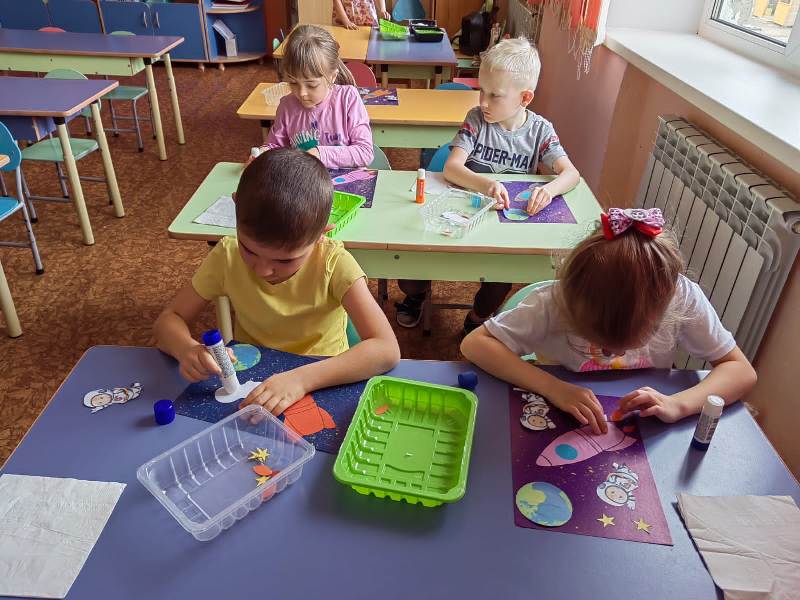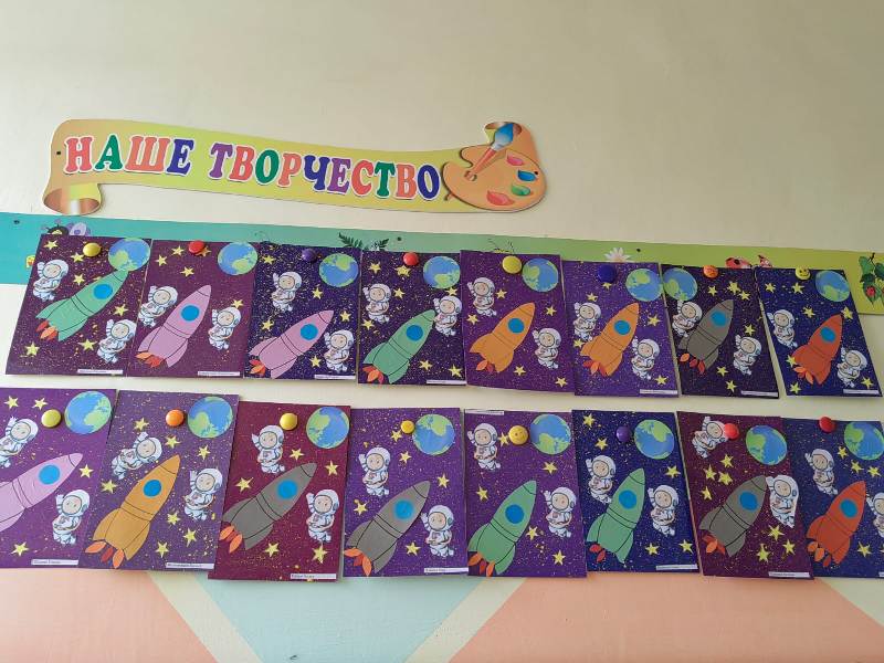 11 апреля воспитанники старшей группы вместе с воспитателем Нукревой Александрой Геннадьевной клеили аппликацию – Космическая ракета.